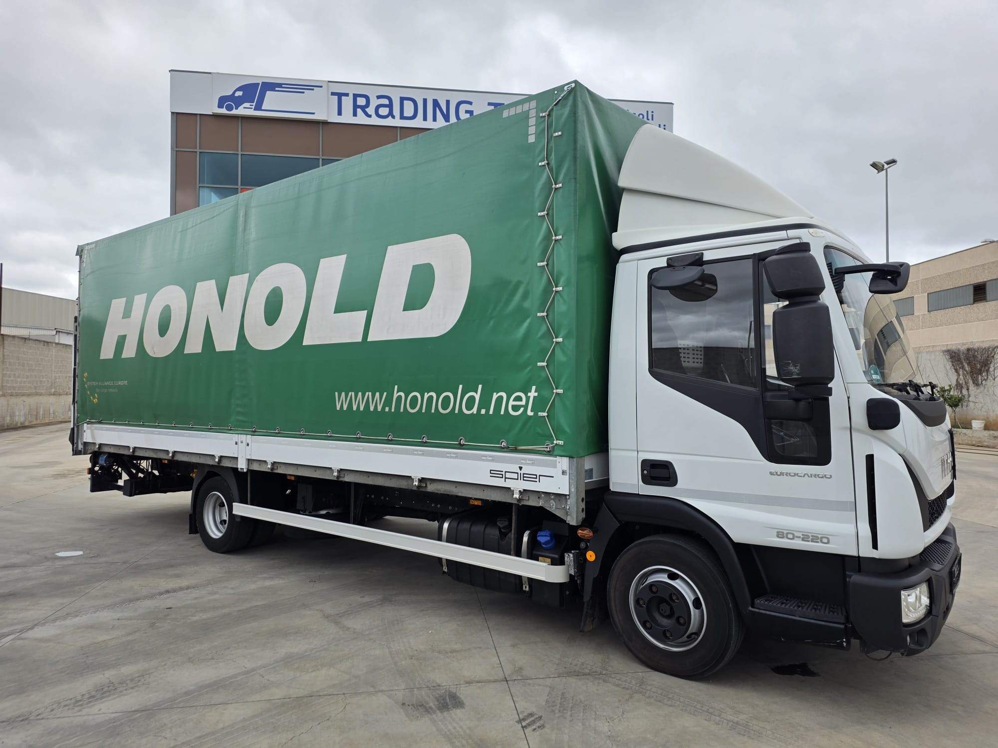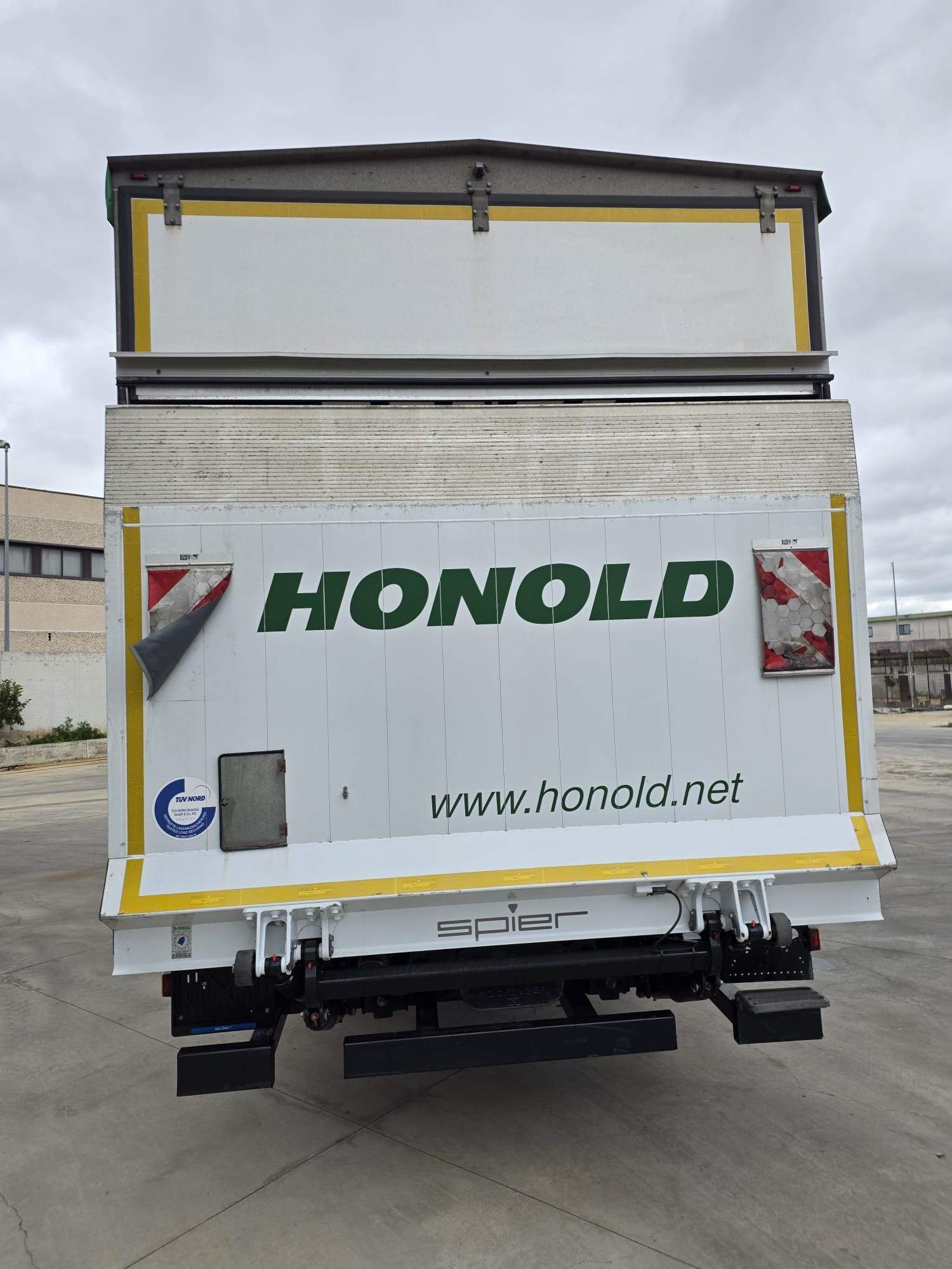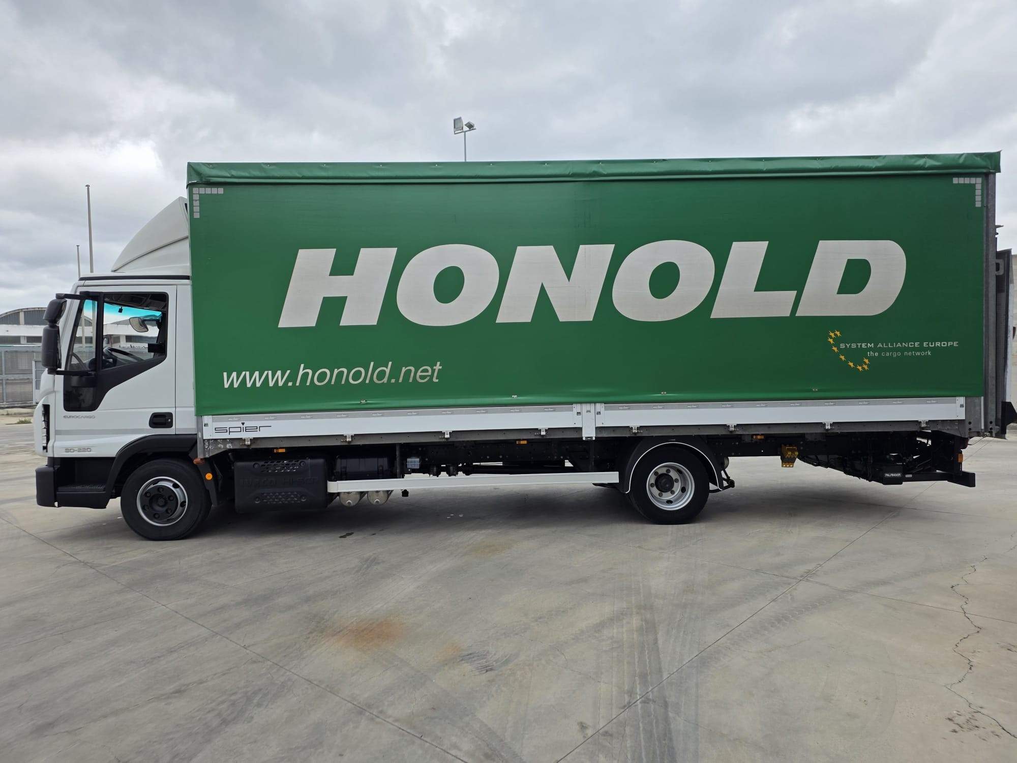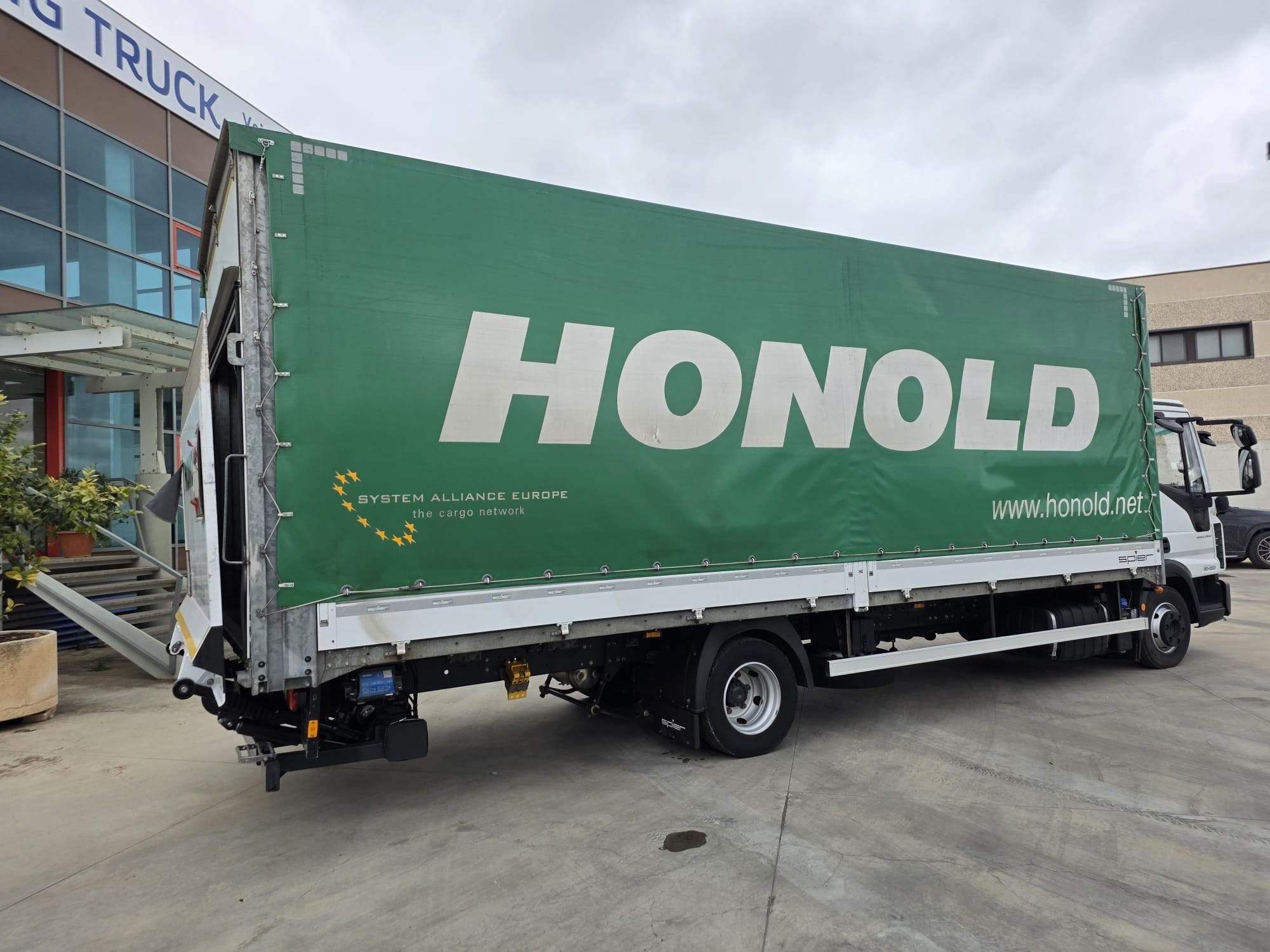 cassone fisso con centina e telone con lato sx scorrevole, pedana posteriore di carico, pedana a battuta da 15 Q., lunghezza cassone 7400, larghezza 2550, altezza 2550